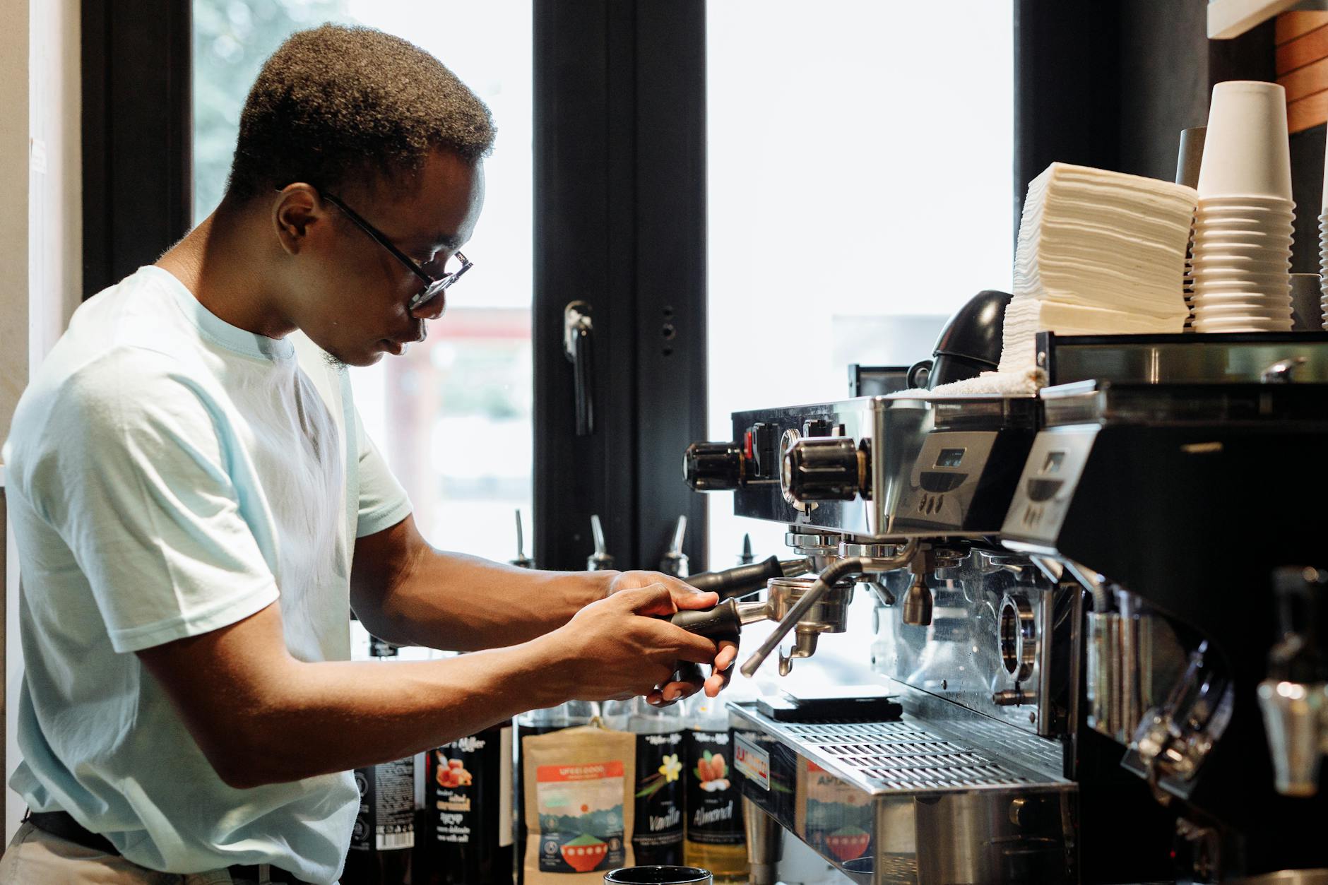 Barista realizando equipment maintenance em máquina de café